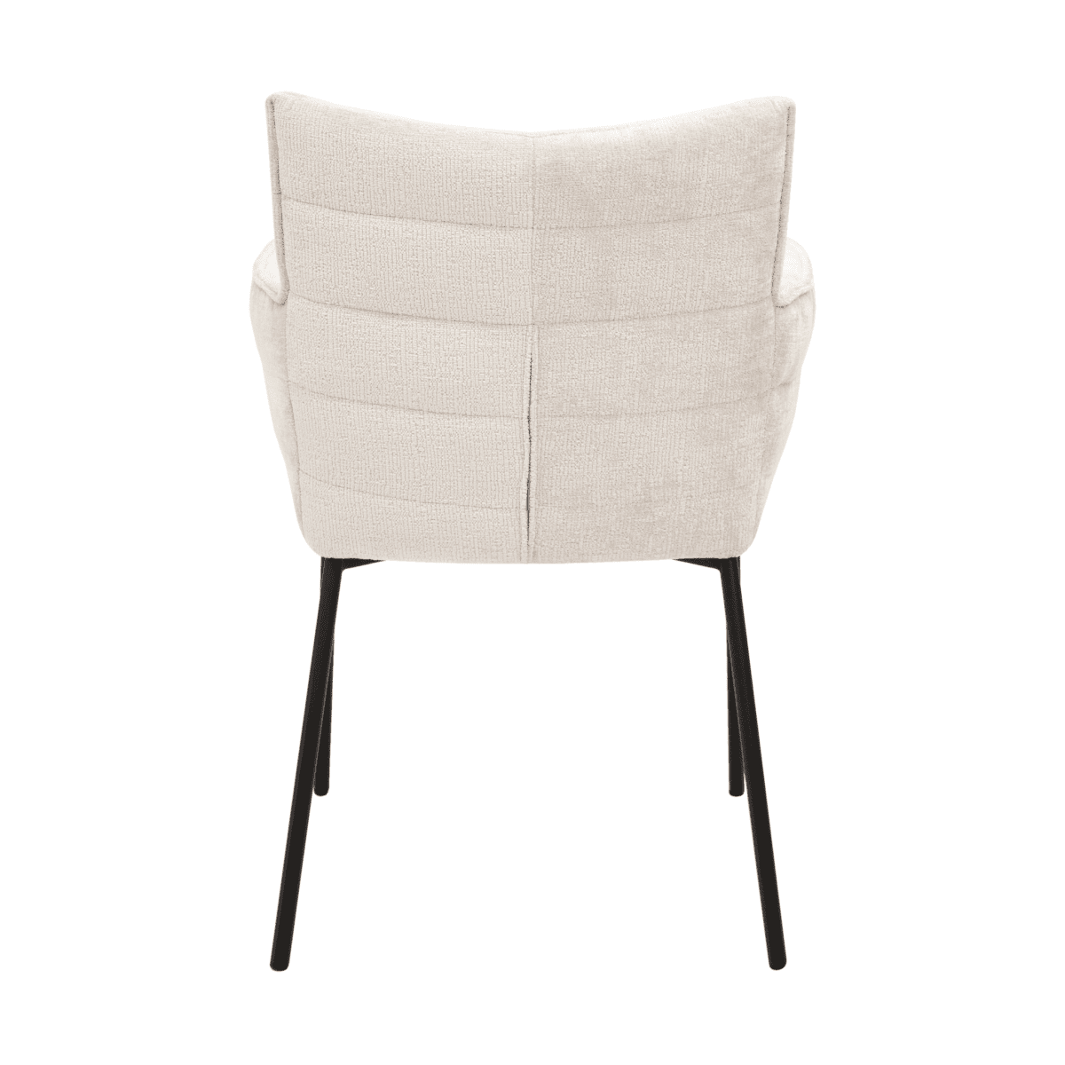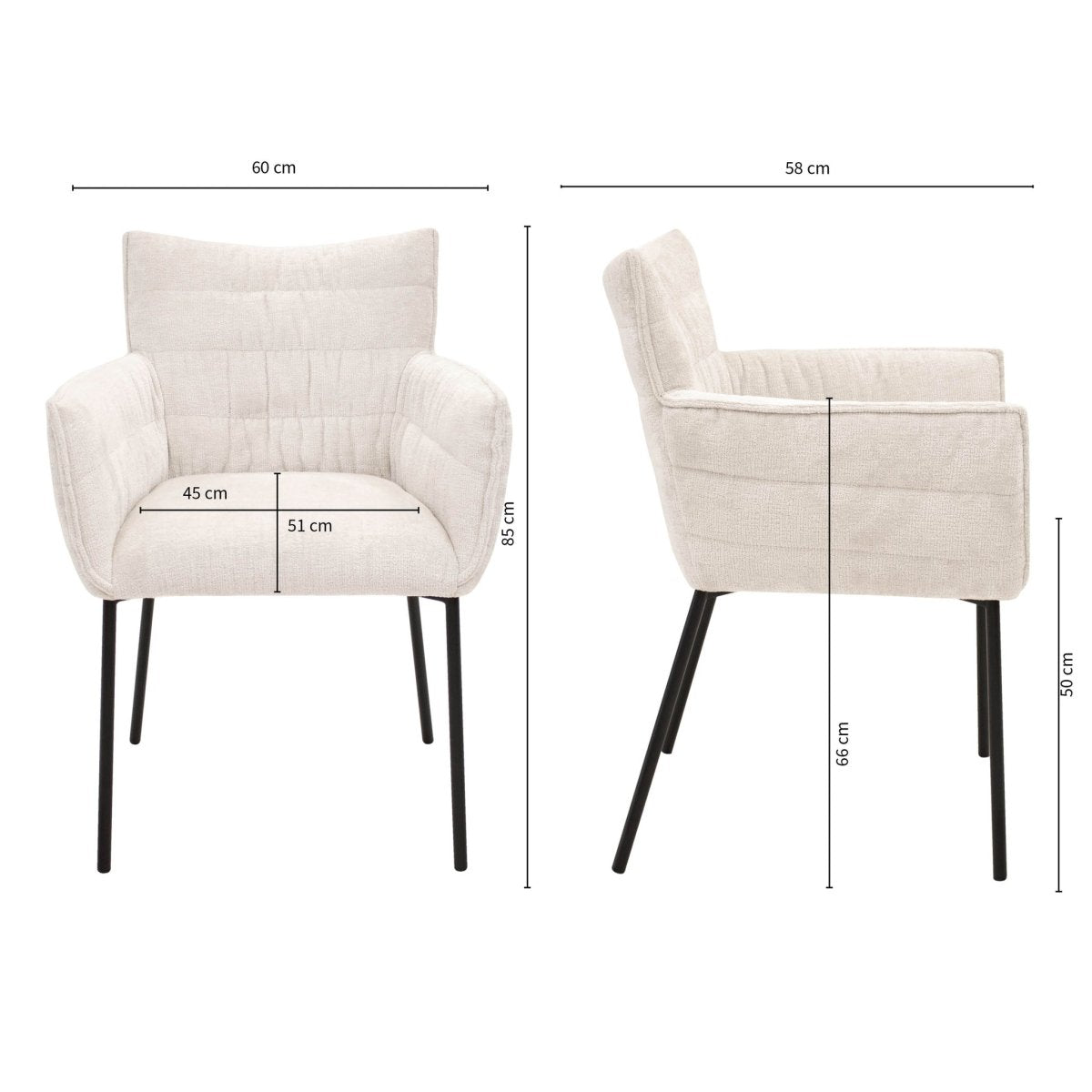 Dimensions utiles: hauteur d'assise 50 cm, profondeur d'assise 43 cm et hauteur d'accoudoir 66 cm, ce qui facilite l'installation autour de tables standards et favorise une posture naturelle pendant les dîners.
