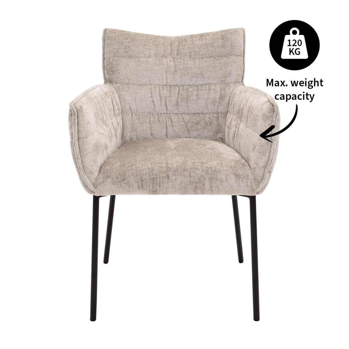 Son revêtement en tissu Chenille doux offre une assise luxueuse, et le cadre en métal noir garantit stabilité et élégance contemporaine. Disponible dans différentes couleurs, elle s’adapte facilement à votre décoration, du bord contemporain au style chaleureux. Les dimensions précises — hauteur d’assise de 50 cm, profondeur d’assise de 43 cm et hauteur d’accoudoir de 66 cm — assurent un confortOptimal pour les repas, les échanges et les sessions de travail léger autour de la table.