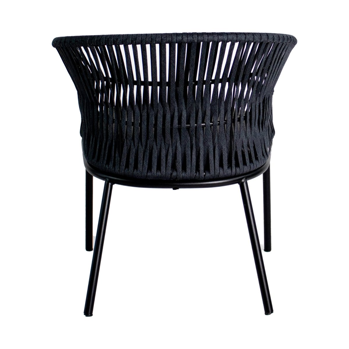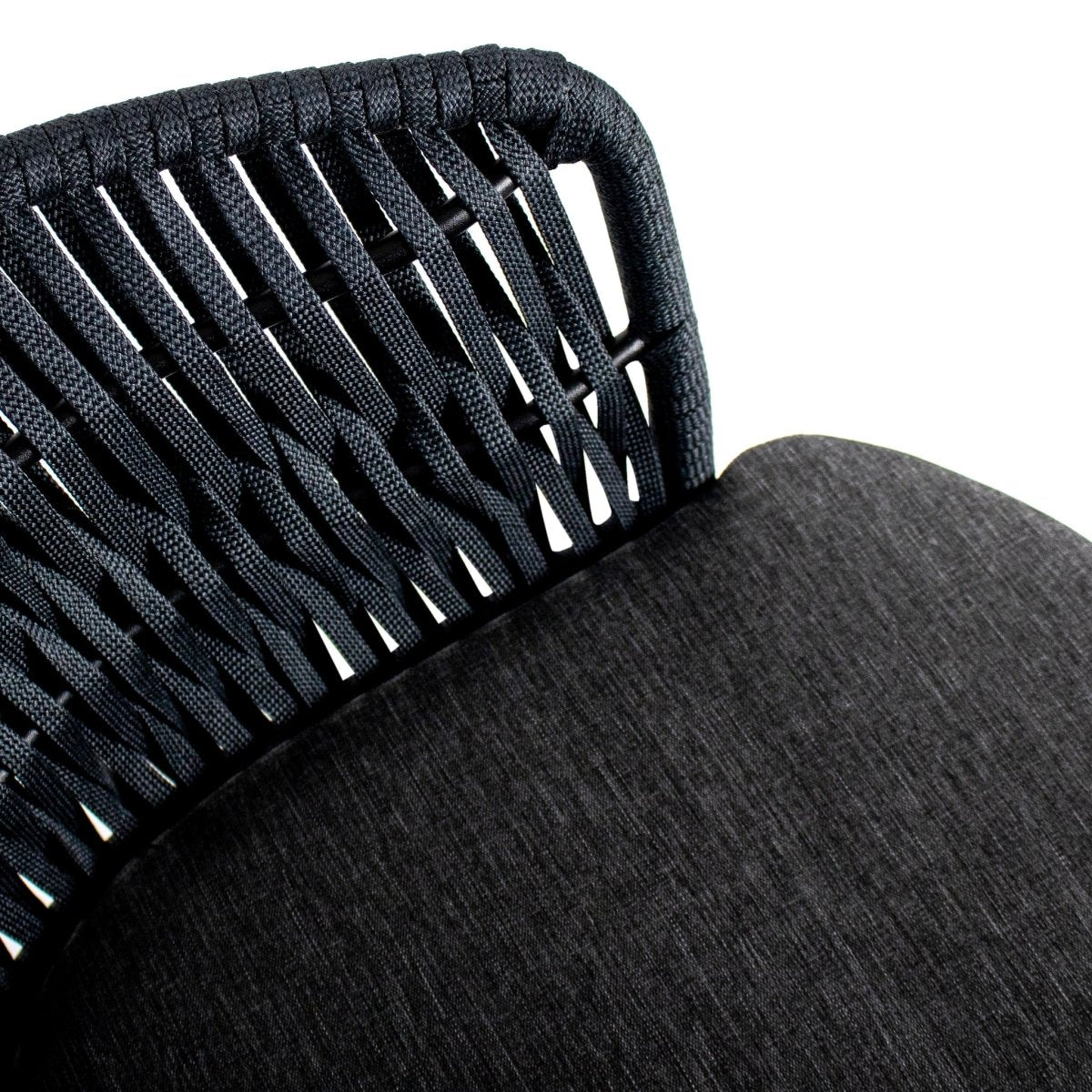 Chaise Longue Jardin Confort Moderne Design Extérieur — KYRA est l'alliée idéale pour un été chic et détendu. Ce fauteuil d'extérieur associe un dossier ajusté et un siège rembourré, pour des pauses en plein air sans compromis. Sa structure en métal noir robuste est sublimée par un cordon large anthracite, apportant une touche ludique et moderne à votre terrasse ou jardin.