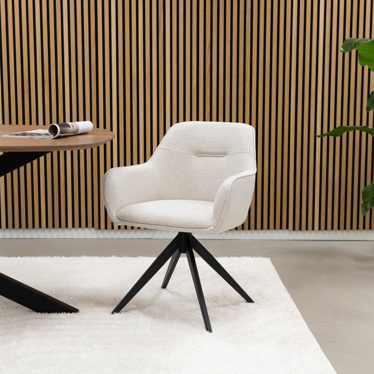 Sa base pivotante 360° et sa fonction de retour automatique facilitent les transitions entre repas et discussions. Disponible en 4 couleurs pour s'adapter à votre style, elle s'accorde aussi bien avec un décor minimaliste qu'un intérieur plus chaleureux.